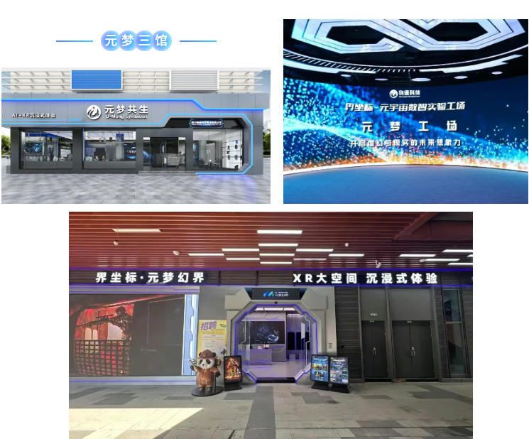“元梦三馆”体系自创立以来,承载着物通科技集团在AI+XR融合服务中的空间策略与运营模型探索。三馆分别承担内容验证(元梦工场)、市场运营(元梦幻界)、政企复制(元梦共生) 功能,构建起“内容——用户——应用”的协同闭环结构。