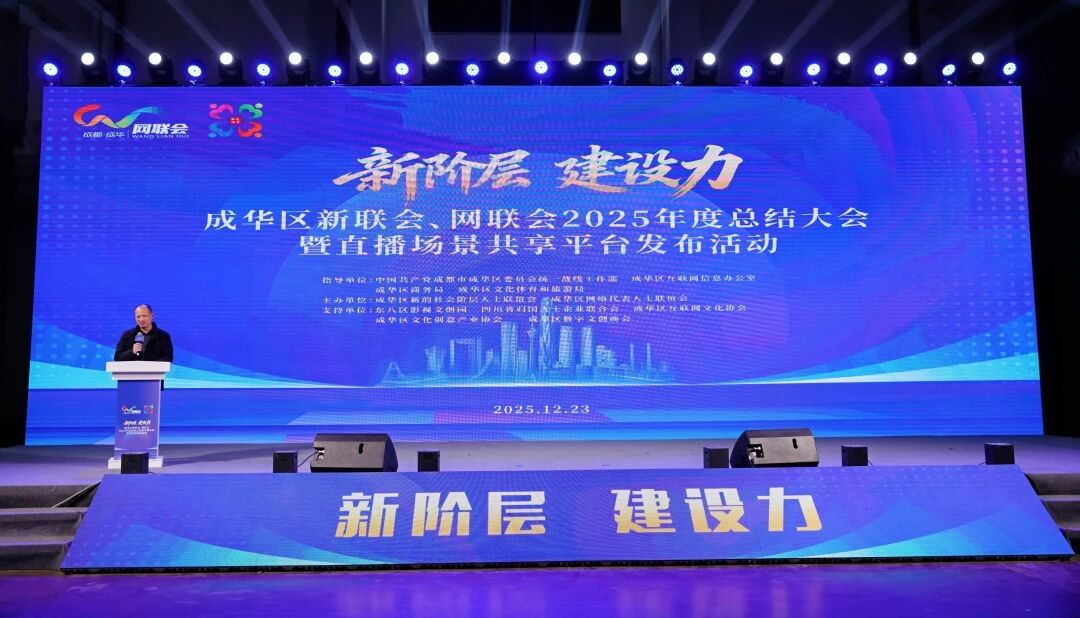 2025年12月23日下午,成华区新联会、网联会2025年度总结大会暨直播场景共享平台发布活动在东八区影视文创园成功举办。四川物通科技集团总经理袁梁受邀出席活动,并凭借在推动企业创新发展、参与区域产业建设等方面的综合表现,荣获大会颁发的 “建设力之星”个人奖项。