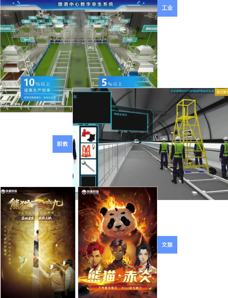 在工业领域,为泸州某知名酒企打造的白酒生产数字孪生系统,实现了酿造过程的精准监控与能效优化;在职教领域,为地铁轨道交通开发的VR全岗位仿真实训系统,为高风险岗位提供了安全、高效的技能培训新路径;在文旅领域,公司原创的“熊猫IP+XR”沉浸式体验模式,已在“元梦幻界·XR大空间沉浸式体验馆”形成标准化运营输出。